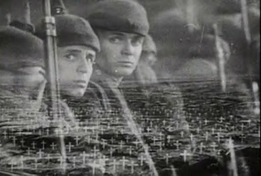 „All quiet on the Western front” este din 1930 şi, aşa cum scrie şi pe carcasa dvd-ului, a fost interzis în ţările ce se pregăteau să pornească cea mai sângeroasă luptă din istoria umanităţii. Filmul prezintă aventura unui grup de soldaţi germani părtaşi la evenimentele Marelui Război chiar de acolo din prima linie. Începutul, după care în mod cert s-au inspirat şi producătorii lui „Joyeux Noel”, prezintă o sală de clasă în care un profesor în vârstă le ţine elevilor săi un discurs despre cât de frumos este să mori pentru patrie. Elevii, bineînţeles, sunt fascinaţi de vorbele profesorului lor şi îndemnaţi să se înroleze în armata germană nu ezită pentru că o astfel de experienţă, „care nu va dura decât vreo câteva luni, are menirea de a vă căli”. De aici începe iureşul. Filmul este memorabil prin replici şi prin modul în care transpune disperarea şi frica fără a beneficia de un fundal sonor specific momentului sau de mişcări „slow-motion”, aşa cum se obişnuieşte în ziua de azi. Trei scene mi-au rămas întipărite profund pe retină: discuţia filosofică purtată de soldaţi la popotă, dialogul din craterul de obuz dintre un soldat neamţ şi victima sa franceză, precum şi faimoasa scenă cu soldatul ce este împuşcat atunci când iese din tranşeu pentru a atinge un fluture.