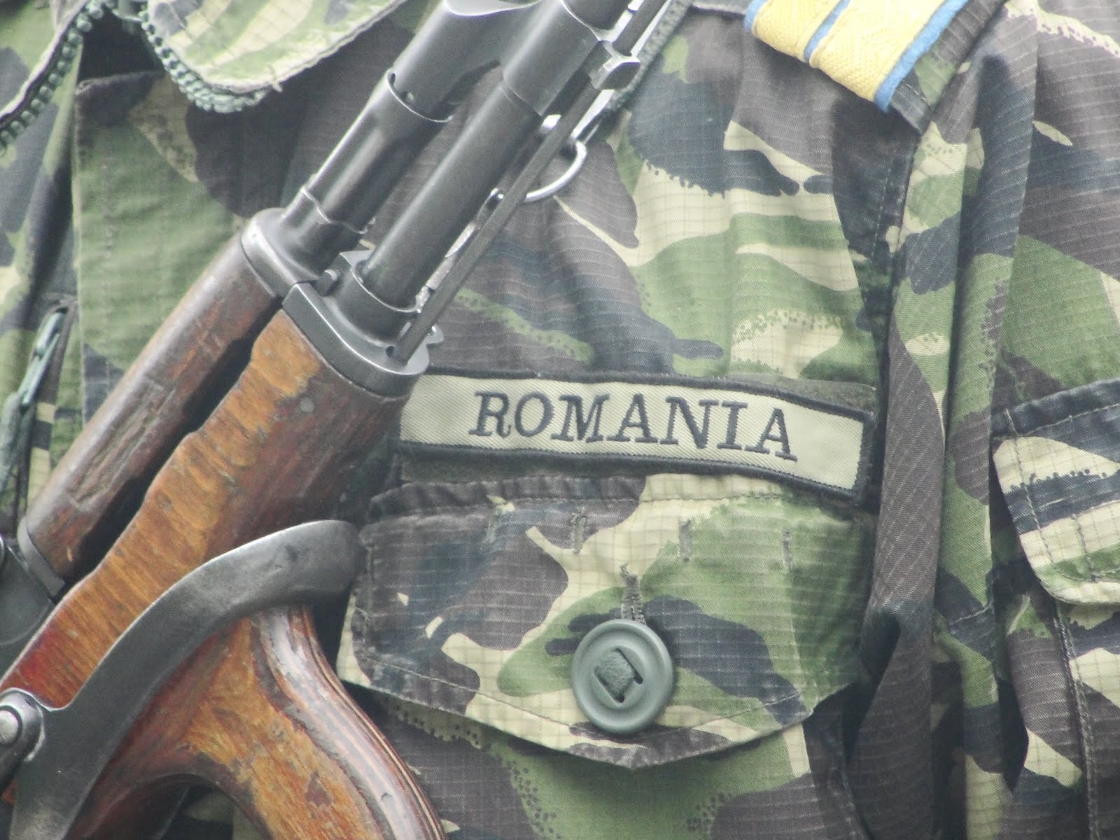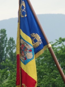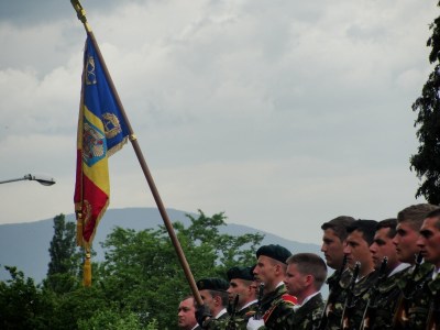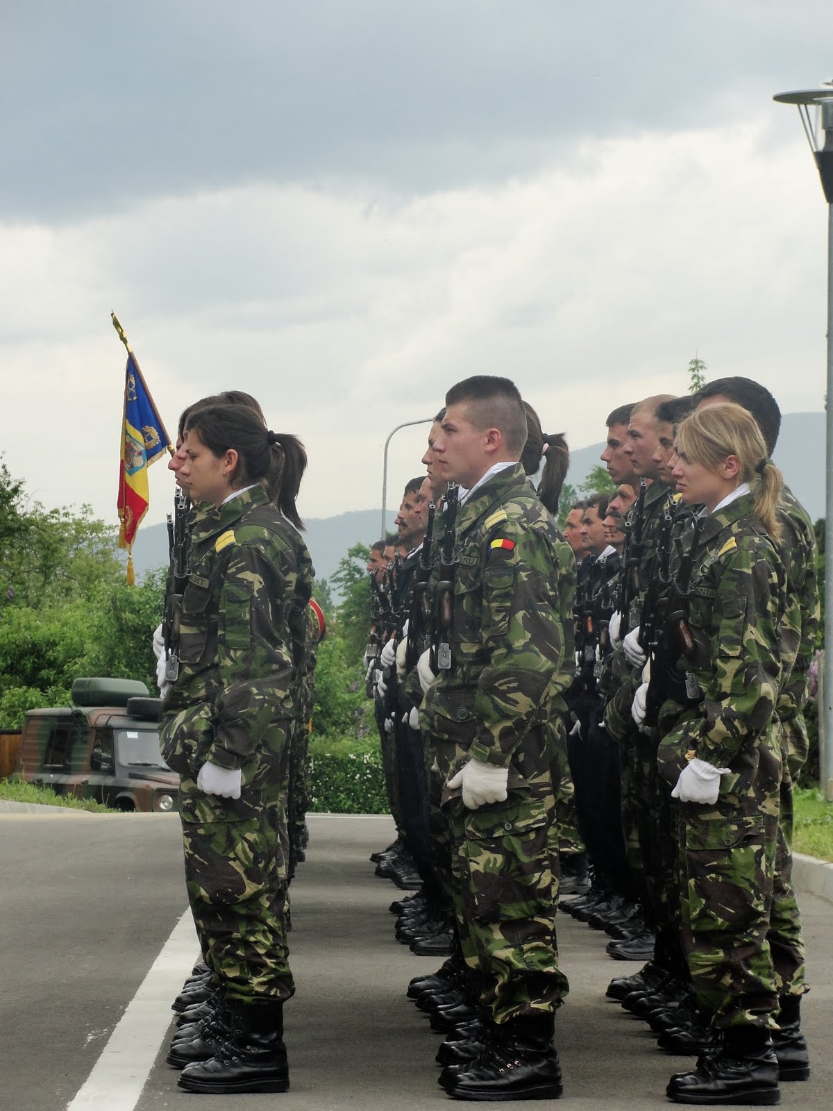 Soldaţi tineri, băieţi şi fete, stând demni lângă tricolor