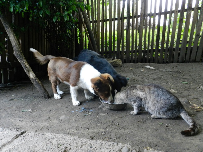 Iar acum, despre căţei. Pe unu’, cel negru, îl cheamă Bursuc, iar pe celălalt Bobiţă. Deşi nu seamănă deloc unu’ cu altu’, cică ar avea aceeaşi mamă, adică-s fraţi. Bobiţă e mai mic din punct de vedere al vârstei şi mereu aleargă de bezmetic. Frac’su, ca orice frate mai mare care ţine la ghindoc, nu ezită să se alerge cu el prin curte şi să se joace. Evident, ca să pot merge prin curte liniştit, fără ca ei să-mi ia măsura la picior, a trebuit să le arăt că „I’m their brother from another mother” cu nişte felii de chec. A funcţionat.
