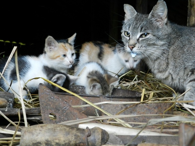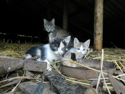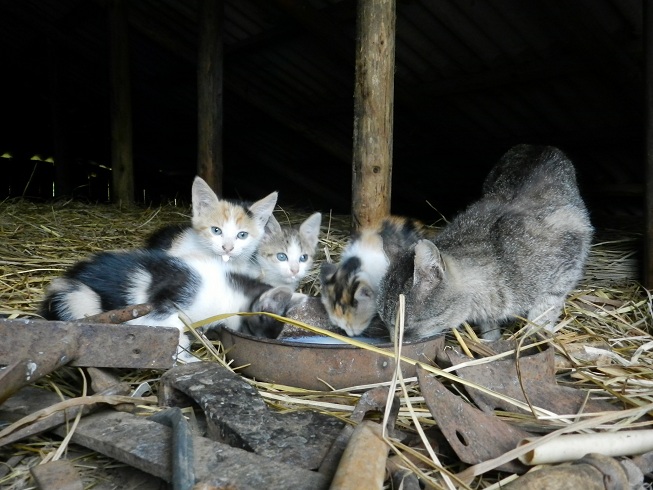 În primu’ rând, despre puii de mâţă. Sunt patru la număr şi stau în podul casei. Au loc berechet să alerge ca nişte mici tigrişori ce sunt fără riscu’ de a fi ciocăniţi în cap de găini sau cei doi cocoşi. Fiind pisoi de la ţară au şi o mamă care ţine la ei. Mă-sa lor e gri iar seara, când Moş Aurel urcă în pod să le pună lăptic, se adună toată familia în jurul castronului. Mama lor ia câteva guri de lapte apoi veghează ca nu cumva dubiosu’ cu aparat foto să încerce ceva aiurea. Tatăl este unul absent, preferând să alerge după alte cozi de mâţă în loc să aibă grijă de buna creştere a pisoilor. Un bulangiu cu blană, ce să mai…