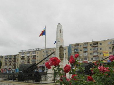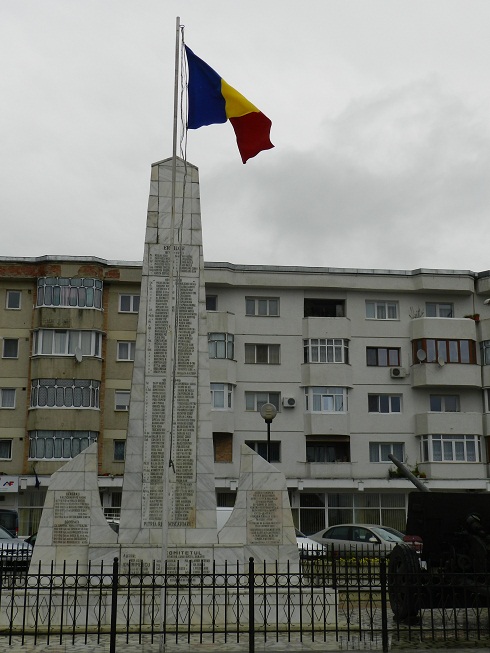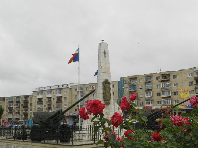 Asta-i faţada monumentului, ca să zic aşa. Două tunuri anti-tanc şi un porumbel veghează. Pe „verso” sunt trecuţi fii oraşului căzuţi în cele trei războaie.