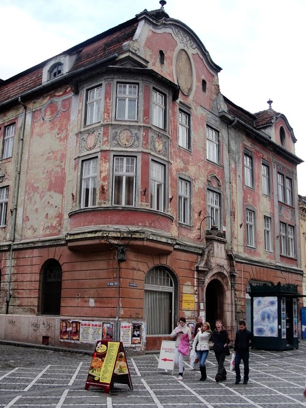Mai jos, Maternitatea şi fosta Bancă Săsească, acum „clădirea aia roz de pe Republicii” la care toată lumea cască ochii şi se miră că încă n-a căzut.