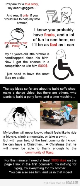 9GAG.com, pentru cei care nu ştiu, e un site unde băşcălia faţă de orice e ridicată la rang de virtute. Nici 11 septembrie 2001, nici fraudarea alegerilor din Rusia, nici Dumnezeu însuşi n-au scăpat de, hai să-i spun, luarea la mişto. Dar nu despre asta e vorba acum. E vorba despre cum o comunitate care găseşte că e de râs din orice şi oricine, se poate ralia unei idei nobile. Un tip din Ungaria, Janos Szolnoki, a participat la un concurs organizat de Nescafe Hungary unde trebuia să trimită un clip, să strângă foarte multe like-uri pe Facebook şi să spere că astfel va câştiga premiul de 5000 de dolari cu care-i să ofere frăţiorului său de 11 ani aflat într-un scaun cu rotile un Crăciun de vis.