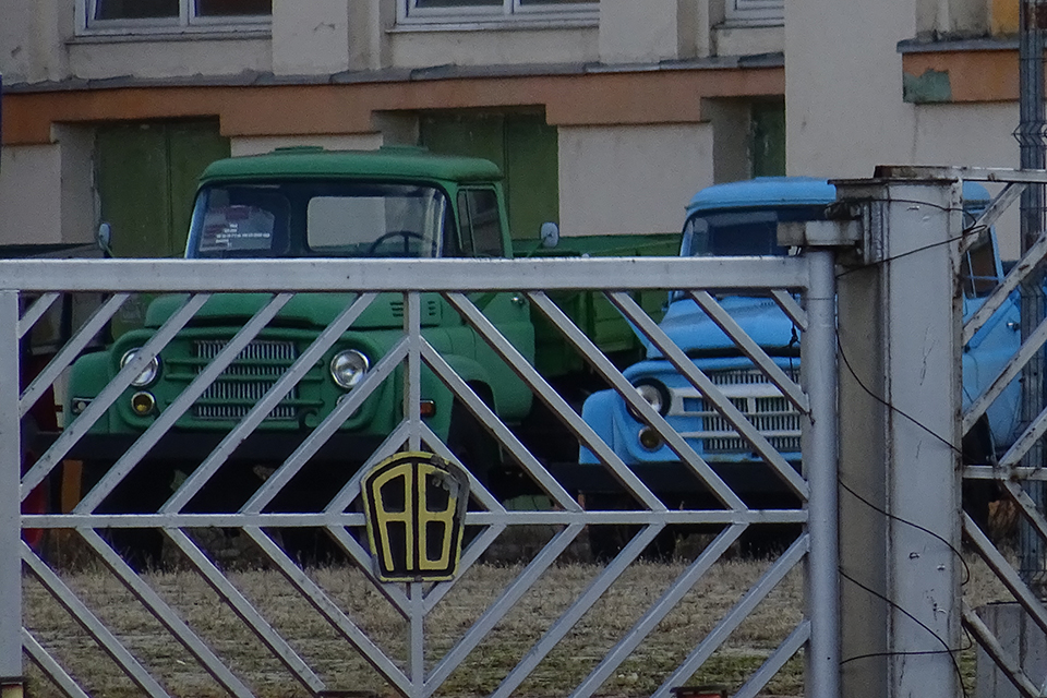 Ce se vede aici sunt două camioane fabricate la uzinele „Steagul Roşu” prin anii 1960 – un al treilea e în dreapta celui verde.