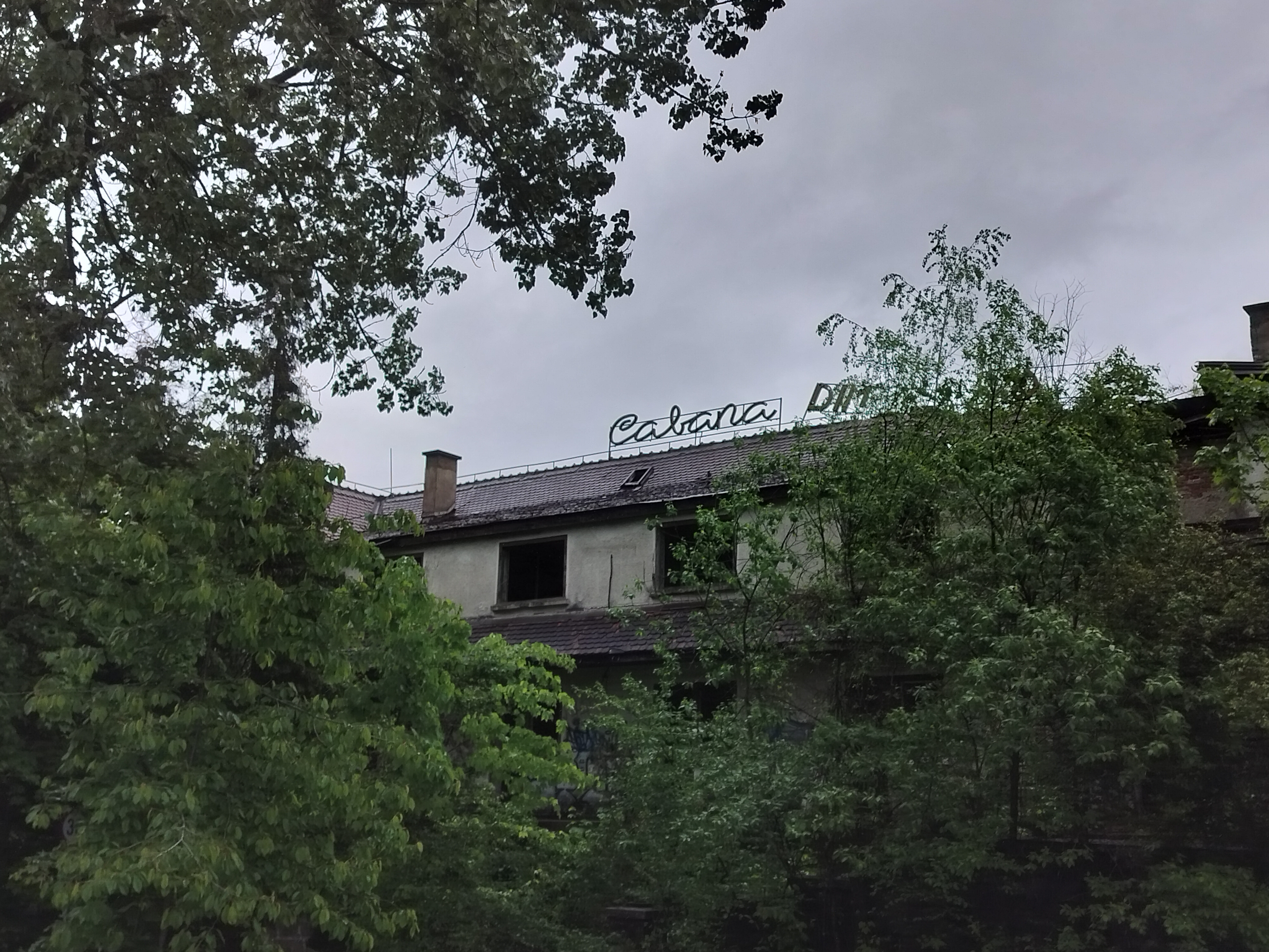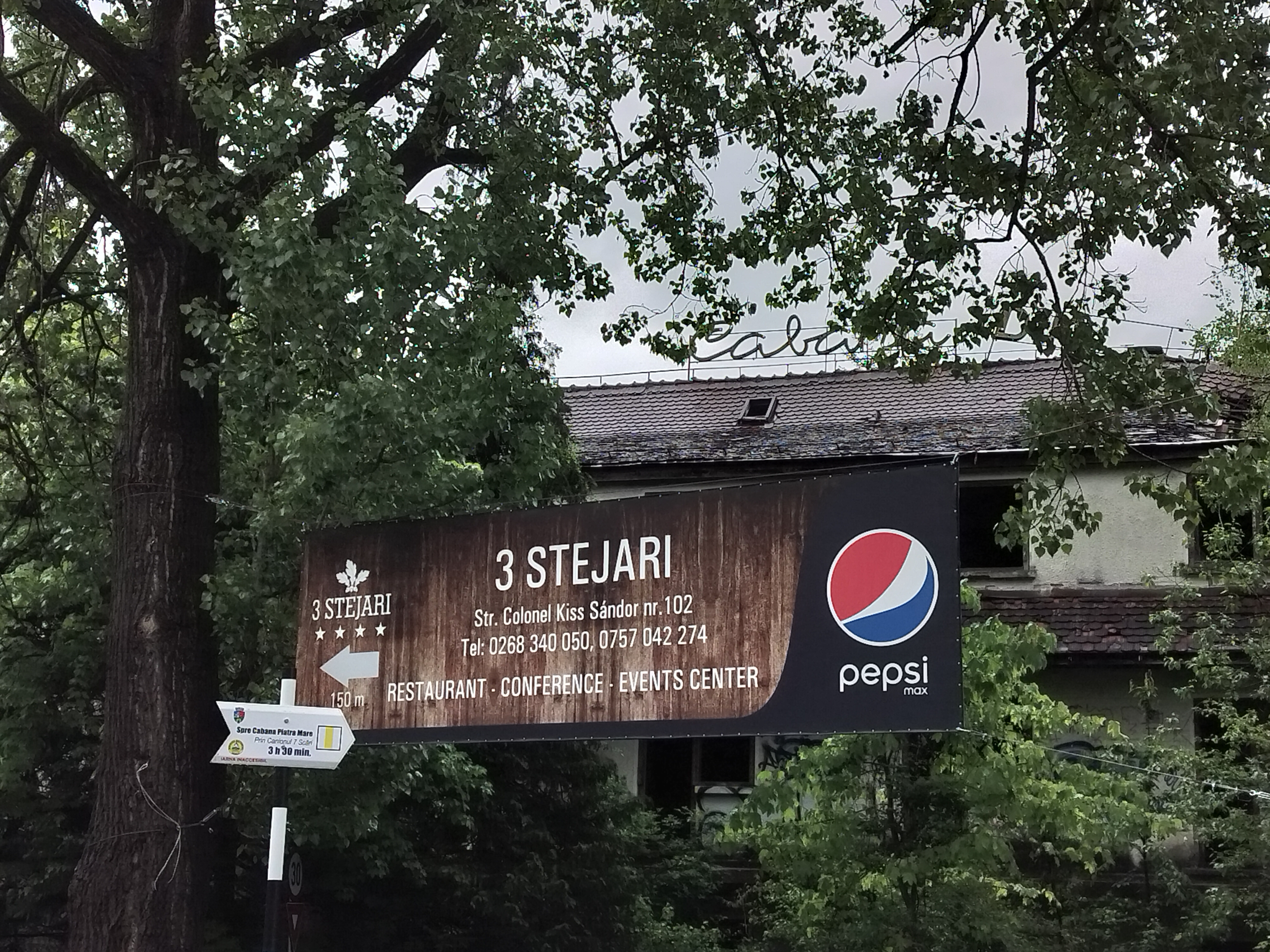Comparând cu imaginile făcute de alții în anii anteriori (aici, 2019, 2013 și 2014), o parte din acoperiș s-a prăbușit, iar firma de deasupra cabanei abia se mai ține. Ce s-a schimbat, însă, este reclama la o pensiune ancorată între doi arbori. Pare că vrea să ascundă priveliștea care bântuie turiștii și drumeții la intrarea pe traseul spre Șapte Scări.